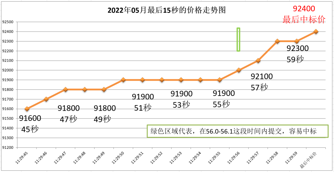 每个月的提交窗口期是不一样的, 这个不是人为控制的,也不是国拍系统提前固定的,而是由当月的20万竞拍人,大家集中在最后几秒先后提交价格而形成的一个排队队伍,来共同决定的。