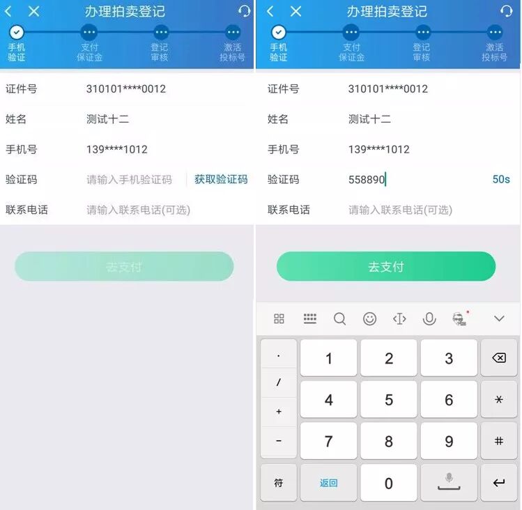 确认信息(证件号、姓名、手机号码),并点击【获取验证码】,并在规定时间内填写验证码,点击【去支付】。