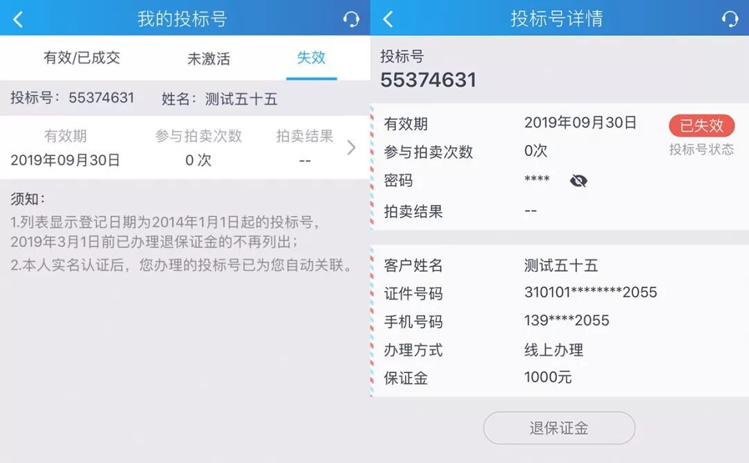点击【我的投标号】,进入投标号列表,查看投标号详情,点击【退保证金】进入退款界面。