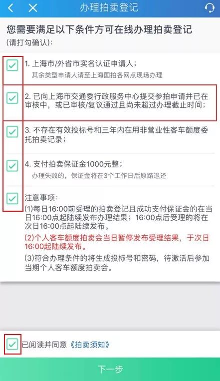 仔细阅读,满足条件,全部勾选界面上的条件及阅读并同意《拍卖须知》,点击【下一步】。