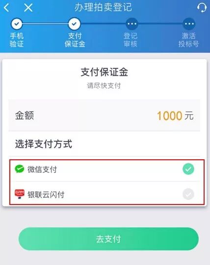 支付成功,提示您的拍卖登记已受理。点击【查看详细办理规则】,可查看详细规则,点击【拍卖登记流水号】,可查看办理详情。