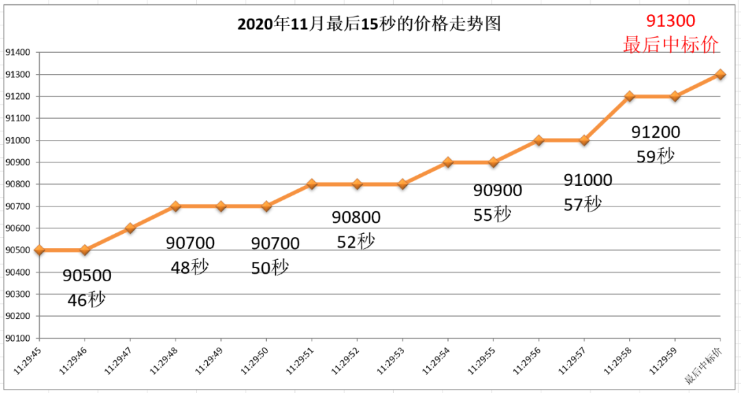 2020年11月上海车牌拍牌的最后一分钟最低价走势如下